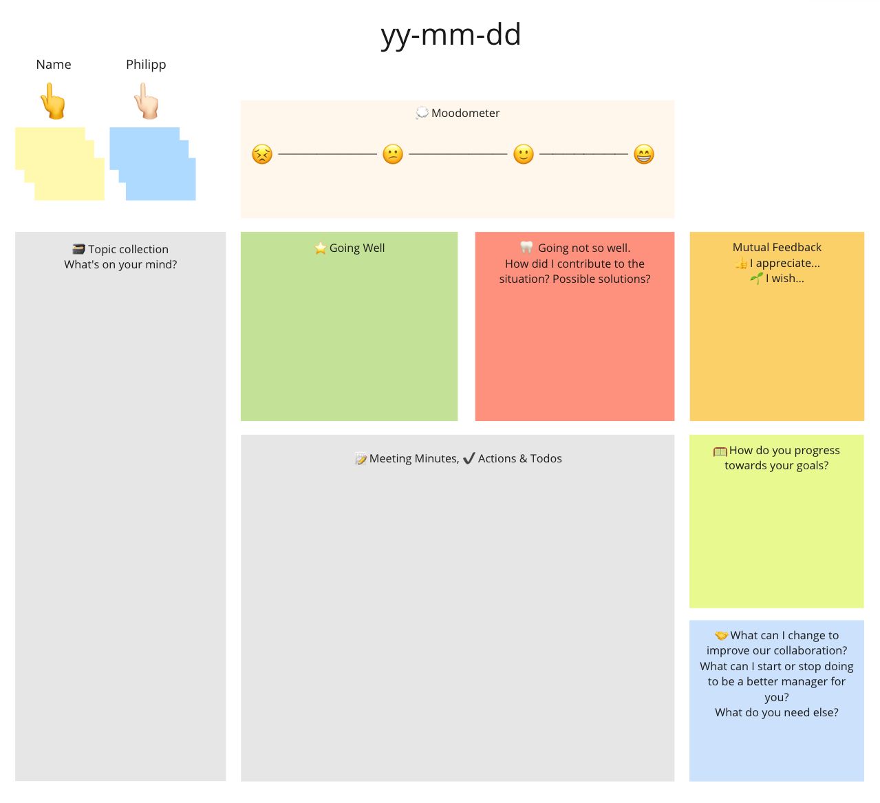 I have my own text-based template that I don’t share with the team member, but the key is to find something that works for you and your team and use it consistently. Hauer’s approach seems like it could work very well for many teams. The one thing I’d add is to leave space for discussion for things not written on a sticky note - team members may well have things they’d prefer to not have so visibly in writing and easily sharable.