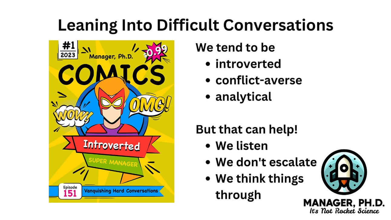 As managers from research, we’re disproportionately analytical, conflict-adverse, and introverted. My experience has been that this tends to make us much more hesitant to have difficult conversations, whether that’s delivering bad news, giving corrective feedback, or stepping into interpersonal conflict.