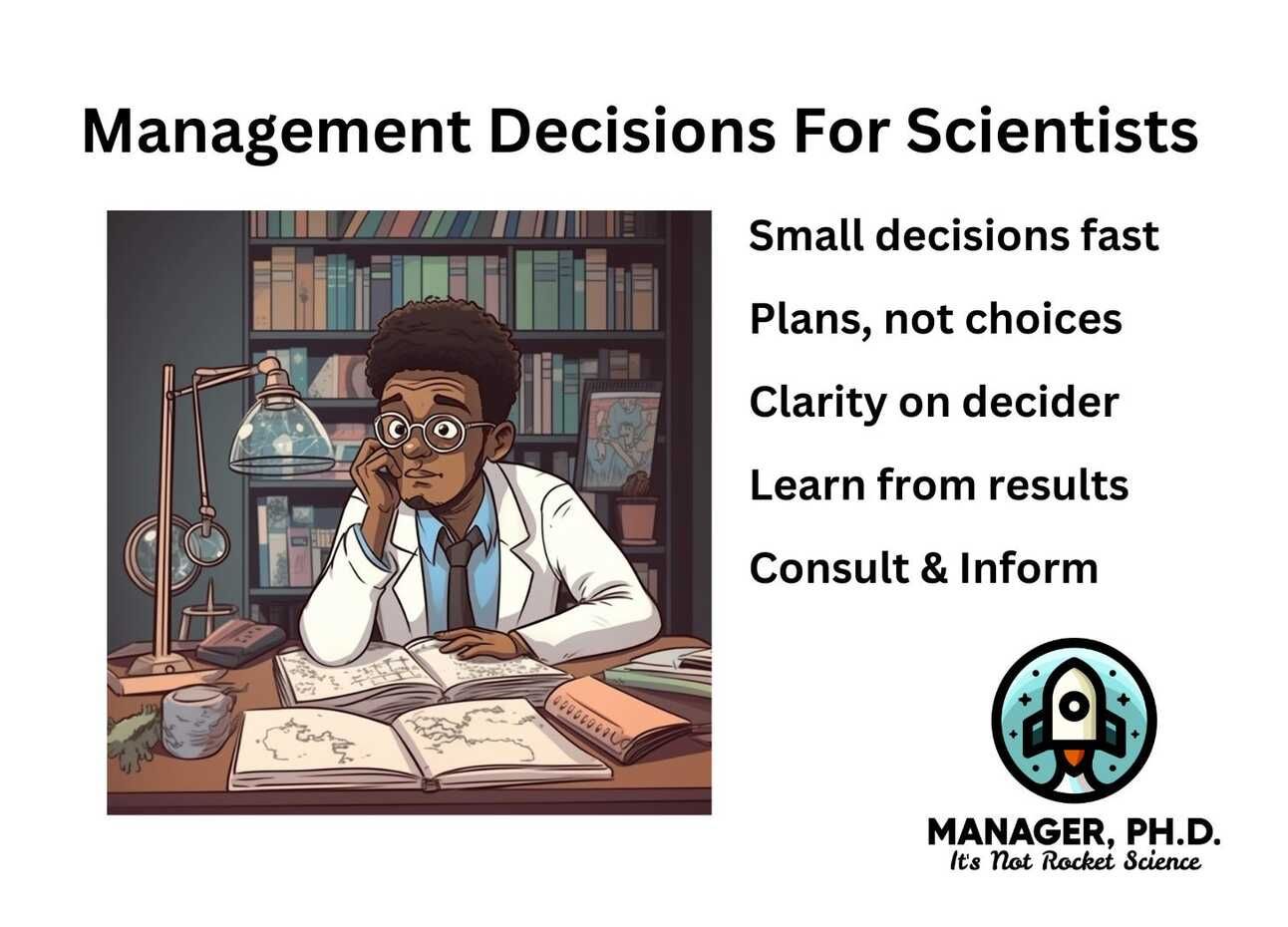 As you get to senior manager or director or senior director, you’re getting asked to weigh in on decisions that have stumped not just the one person, but entire teams or “families” of teams. The easier questions just don’t make it to you (and rightly so). So it becomes even more important to have good decision processes in place, and good “pre-decisions” made such as consistently valuing A over B. I talk about that a little bit in #158, Management Decisions For Researchers.